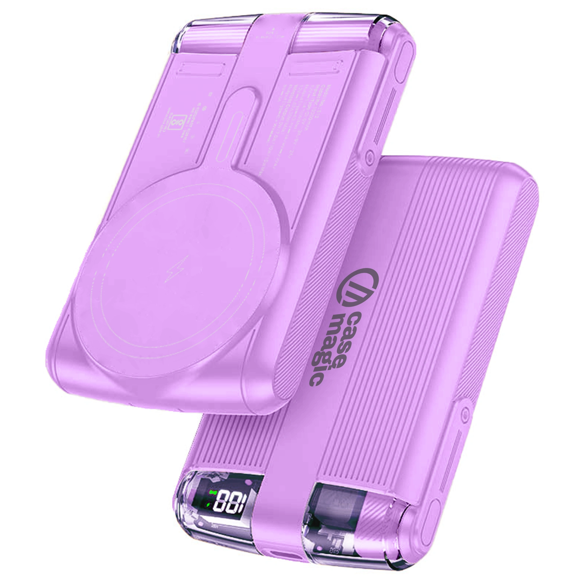 Powerful and stylish 10000mAh Magnetic Wireless Power Bank in Purple with 22.5W fast charging, 15W wireless support, built-in USB-C cable, strong magnetic hold, and smart LED display. Compatible with iPhone, Android & Qi-enabled devices.