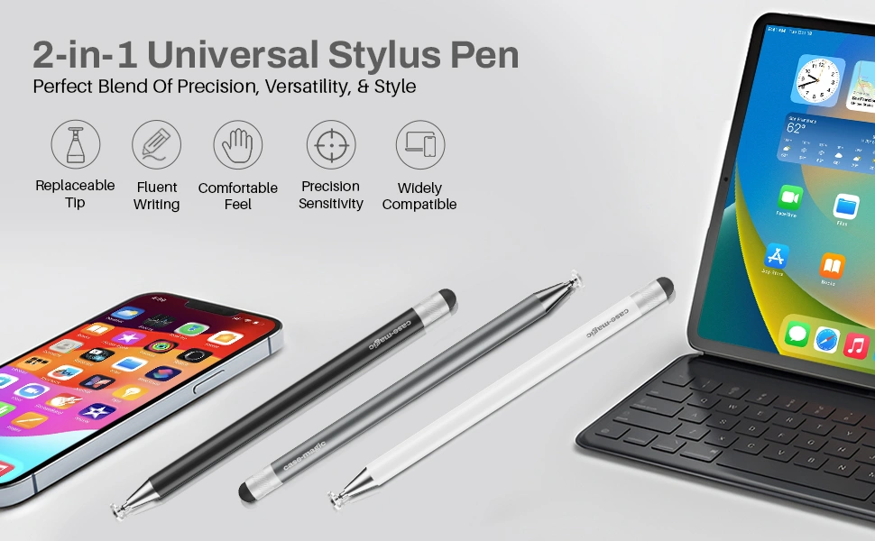 The Case-Magic 2-in-1 Universal Stylus Pen is your all-in-one tool for writing, sketching, and navigating across any capacitive touch screen device. Designed with both a fine point disc tip for precision tasks like drawing or note-taking and a soft rubber fiber tip for smooth scrolling and tapping, this stylus pen for iPad, iPhone, and Android is ideal for students, professionals, and digital artists alike.