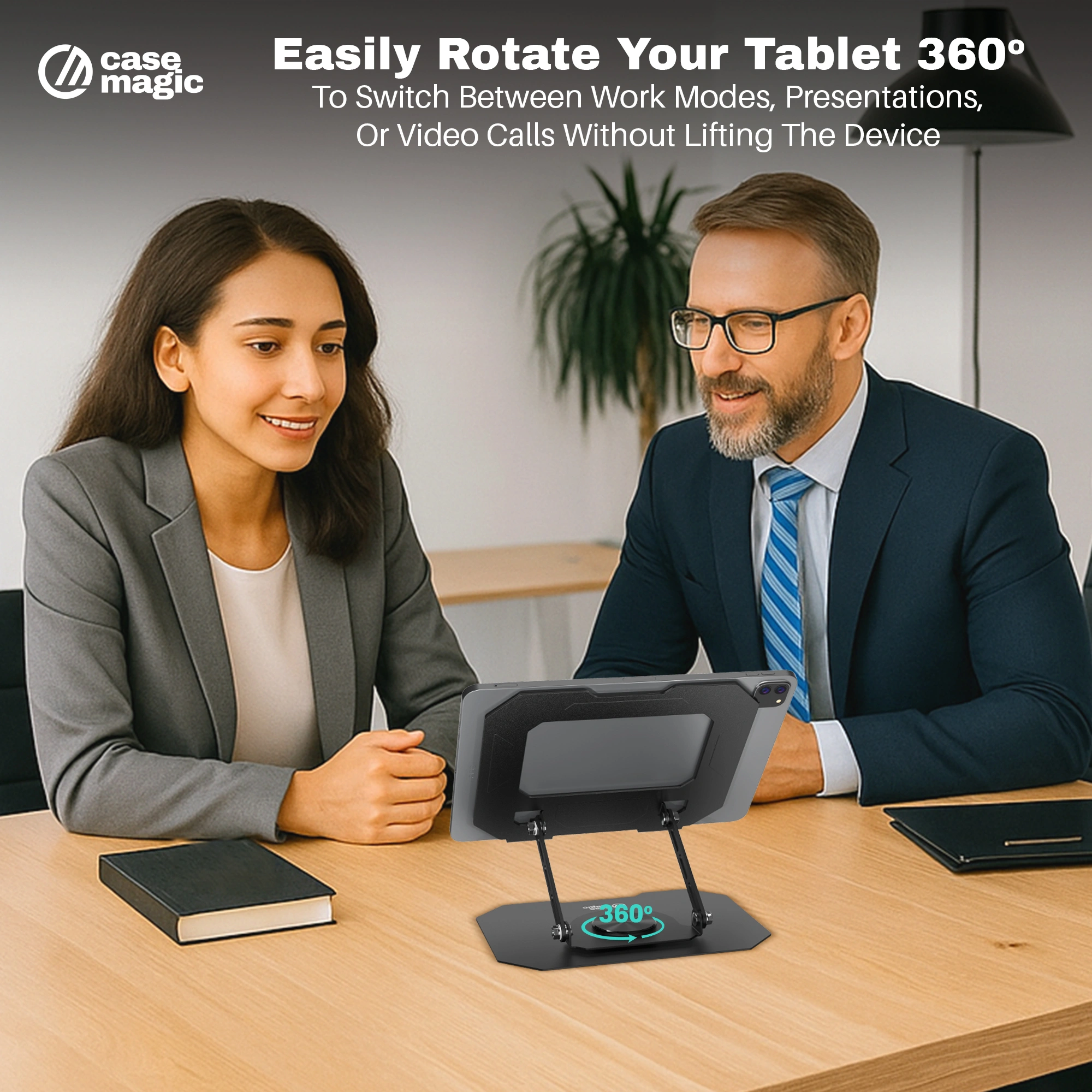 Upgrade your setup with the Case-Magic Tablet Stand Holder, built for durability, comfort, and versatility. This 360° Rotating Tablet Stand Holder for Desk features adjustable viewing angles and a foldable structure, making it the perfect portable tablet stand holder for smartphones and tablets up to 12.9 inches. It helps reduce neck strain and enhances ergonomics for long-term use.
